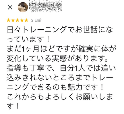 40代になってから体力の衰えを感じ始め、自分では何ともならない体重に、思い切ってシマザキジムに通い始めました。 最初は一人で行くのが不安でしたが、トレーナーさんは、どの方もとても丁寧な言葉遣いで接してくださいます。 安心してトレーニングに集中できました。 ジムは、いつも清潔感があり、女性1人でも通いやすいのが魅力です。 でもトレーニングは想像以上にストイックで、毎回妥協は一切なし。ですがその分、身体が変わっていくのが嬉しくて、通うのが楽しみになっています。 トレーニングも食事も、いつも応援してくれるので、やる気も続きます! また、パーソナルでは珍しく、会員同士の交流イベントもあったり、楽しく続いています。 今では息子もペアトレで一緒に通い始めました! 楽しく、しっかり結果を出したい方にはオススメです!